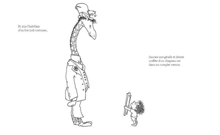 ON EN PARLE ! ● Les Mots de la fin : « Un album loufoque et attendrissant où le non-sens règne pour notre plus grand plaisir. Le texte se fait comptine, le dessin envahit la page blanche dans un rythme déchaîné. Ça remue, ça s’agite et on adore, forcément ! » ● L’Etagère du bas : « Si j’avais une girafe est un album extrêmement bien maîtrisé et Shel Silverstein utilise intelligemment la gestion du blanc dans les doubles-pages. (…) les enfants se laissent bercer par le rythme et la musicalité du texte qui oscille entre chanson et poème, puis s’amusent à vérifier si tous les éléments sont bien présents au fur et à mesure que l’histoire progresse (ainsi que le petit nouveau qui s’ajoute à chaque page). »● MyBoox : « Si l’accumulation est drôle dans les mots, elle est carrément jouissive dans les dessins, où l’on assiste aux galères de cette pauvre girafe qui tente de garder l’équilibre malgré son chapeau-rat, sa colle au soulier, sa chaise dans les cheveux etc. Mais Shel Silverstein ne laisse pas sa girafe dans la panade, et lui retire, un à un, à coup de trocs et d’astuces, tous ses accoutrements encombrants ! » ● Histoire de critiquer : « Un album drôle où on apprend comment obtenir une girafe et demi coiffée d’un chapeau rat dans un complet veston… » ● S’il te plaît, raconte-moi une histoire (Parallèle Mag) : « Dessin épuré en noir et blanc, texte surréaliste et poétique, cet album propose aux petits de travailler leur imagination et leur mémoire, avec un humour décalé d’excellente facture. Intelligent et drôle ! » ● Poison Darling : « Excellente introduction aux rythmes de la poésie ce très bel album plein d’humour et de tendresse, qu’il est plaisant de lire à haute voix, plaira aux plus petits comme aux plus grands grâce à la malice et la bonne humeur qui y règnent. » ● Bruxelles News : « Shel Silverstein s’appuie une nouvelle fois sur le principe d’accumulation pour engendrer une forme de poésie. » ● La Bibliothèque de Chlop : « Quand on aime le grand n’importe quoi (ce qui est mon cas) on ne peut qu’aimer cet album. On rit, on se laisse emporter, on ne se rend même pas compte à quel point cette accumulation dans l’image et dans le texte ressemble aux jeux d’enfants. » ● Deslivresetlesenfants : « Le rapport texte/image est parfaitement synchronisé. Les transformations graphiques semblent s’accélérer au rythme du récit qui sonne comme une comptine. Un ouvrage qui rappelle comme l’absurde peut-être drôle et salvateur ! » ● Quelle histoire pour mon enfant : « Délicieusement tendre, hilarant et poétique, cet album universel décrit tout ce qu’un petit garçon à l’imagination débordante pourrait faire si il avait une girafe… » ● Les sandales d’Empédocle : « Publié pour la première fois aux États-Unis en 1964, cet album non-sense du célèbre Shel Silverstein s’appuie sur le principe d’accumulation. » ● A lire aux pays des merveilles : « Et vous n’avez pas tout vu ! Ni tout lu d’ailleurs, car si l’auteur s’amuse de l’absurde de ces accumulations il sait aussi jouer avec le texte qui se construit sous nos yeux comme un poème. » ● Li & Je : « Tout cela a le charme des comptines et des contes en randonnée. Le dessin est celui d’un caricaturiste habile, vif et insolent. On ne peut qu’encourager la consommation immodérée de cette invitation au désordre et au rêve. » ● Histoires pour les petits : « Au fil des pages, objets et péripéties s’accumulent dans cet album sans queue ni tête qui peut aussi se lire à l’envers. Un classique qui met à l’honneur l’imagination des enfants. » ● Libbylit : « Un album tendre, poétique et hilarant ! Lecture recommandée. »