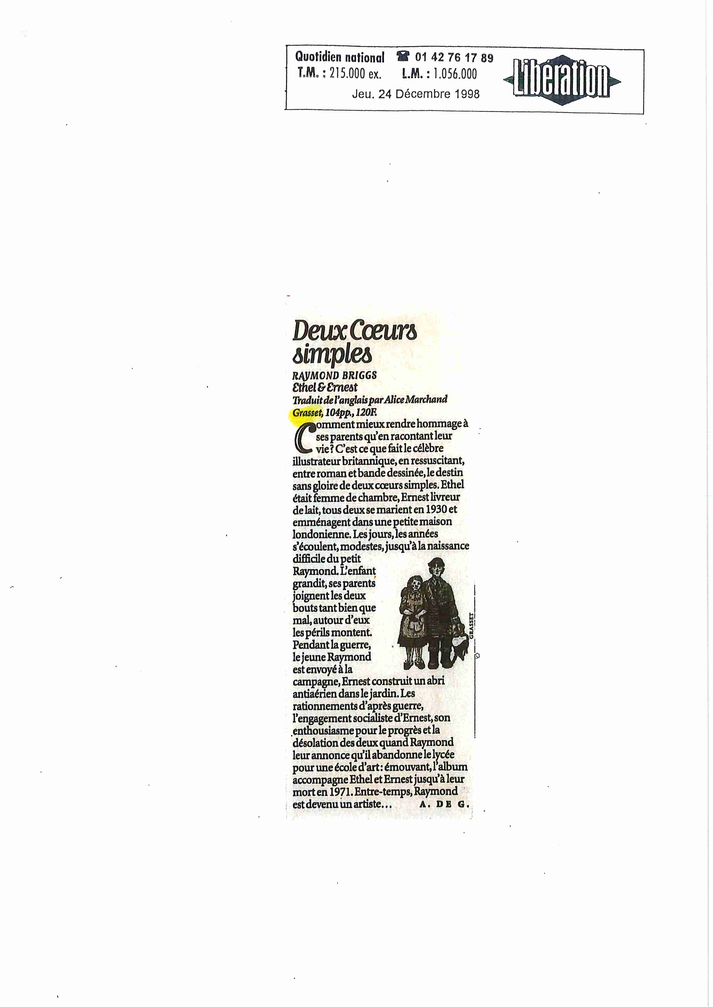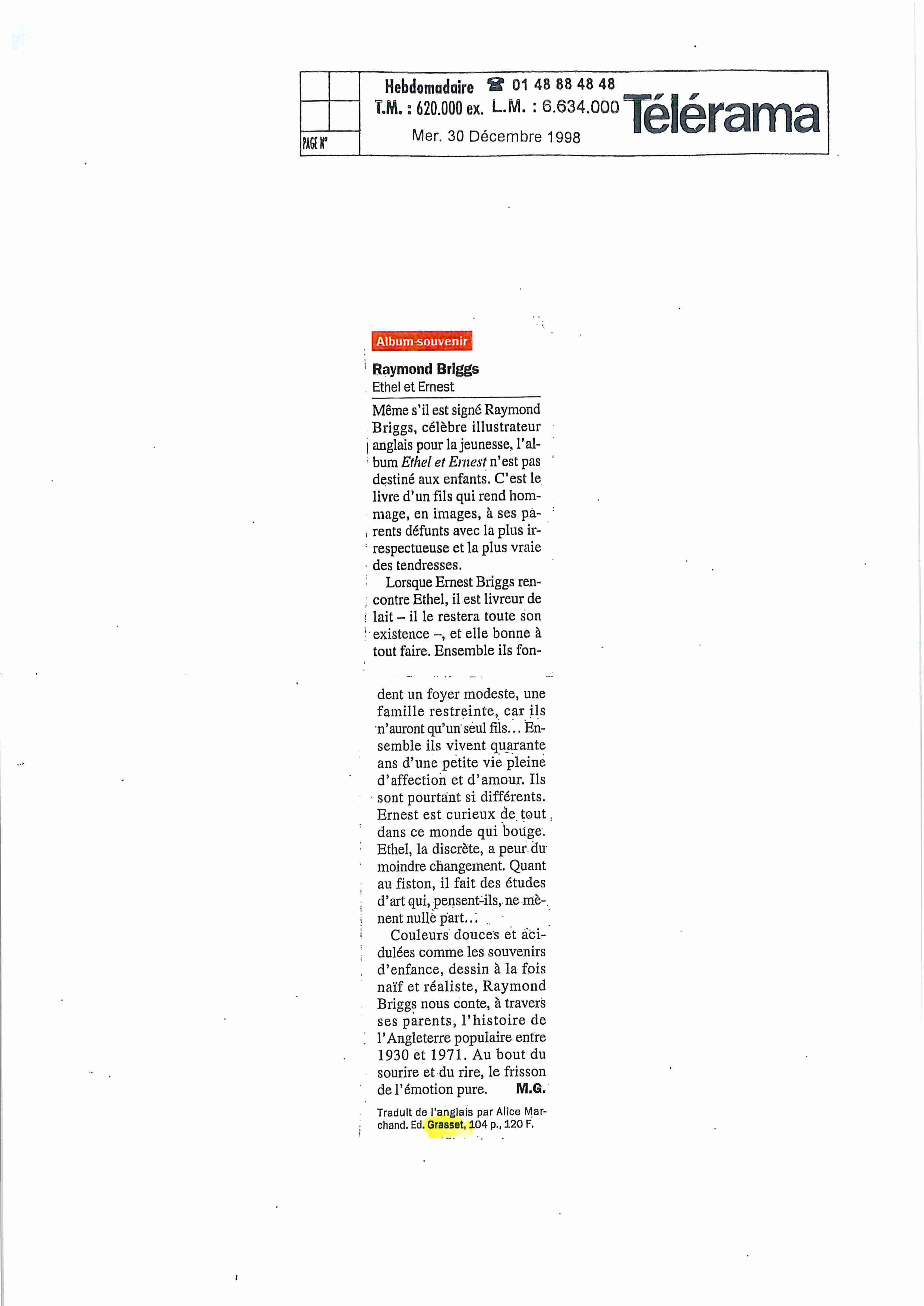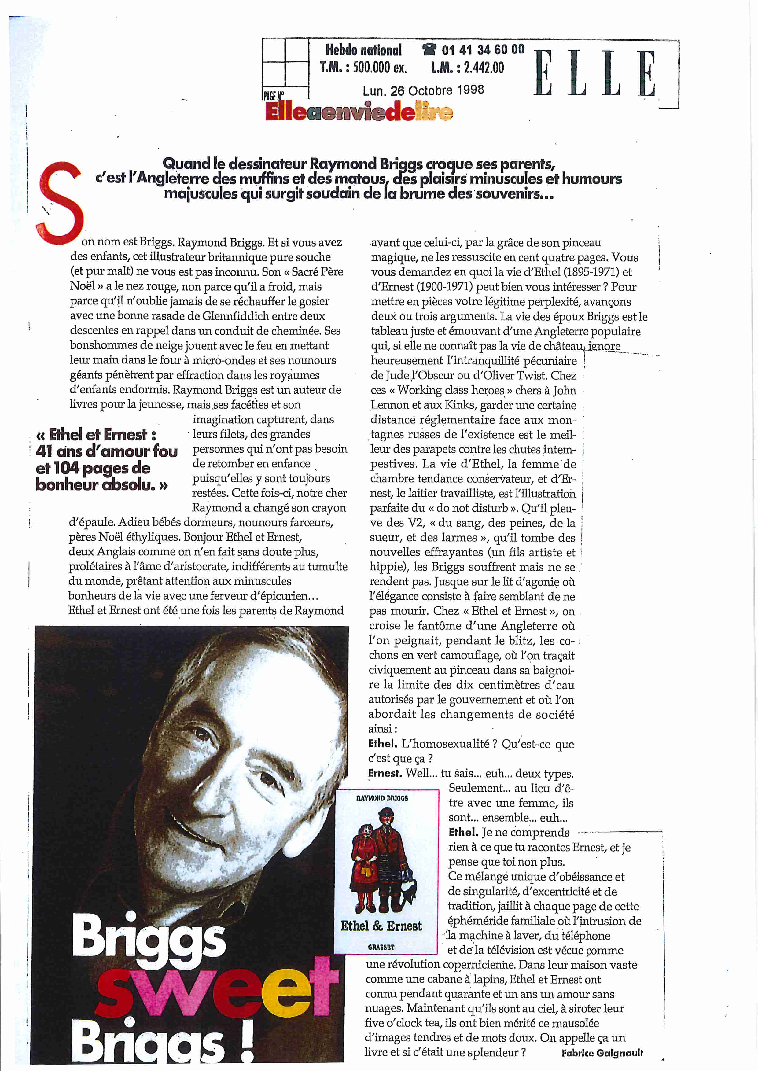 ON EN PARLE ! ● Le Journal du Dimanche : « Cette BD vous remue jusqu’au tréfonds du cœur. À lire absolument. » ● Marianne : « Un chef d’œuvre de la littérature. » ● Télérama : « Au bout du sourire et du rire, le frisson de l’émotion pure. » ● Depuis le cadre de ma fenêtre : « L’histoire n’est pas celle d’un couple fictif mais des parents de l’auteur, Raymond Briggs. Elle est touchante car le regard qu’ils portent sur la société en mutation est souvent décalé et innocent. C’est une page de l’histoire qu’ils nous offrent avec un regard différent : la naissance de la télévision, le téléphone en mutation, le premier pas sur la Lune, les hippies, … Le portrait que l’auteur a dressé, loin d’être lisse ne cache pas les défauts de ses personnages et ils deviennent comme des membres de notre famille que l’on prend plaisir à voir se chamailler, qui nous font sourire par des réparties plus drôles les unes que les autres et qui nous montrent une innocence souvent perdu qui les rend attachants. Il existe également un superbe animé réalisé par Roger Mainwood, sorti en 2016 pour ceux qui aimeraient poursuivre ou commencer par là. » ●