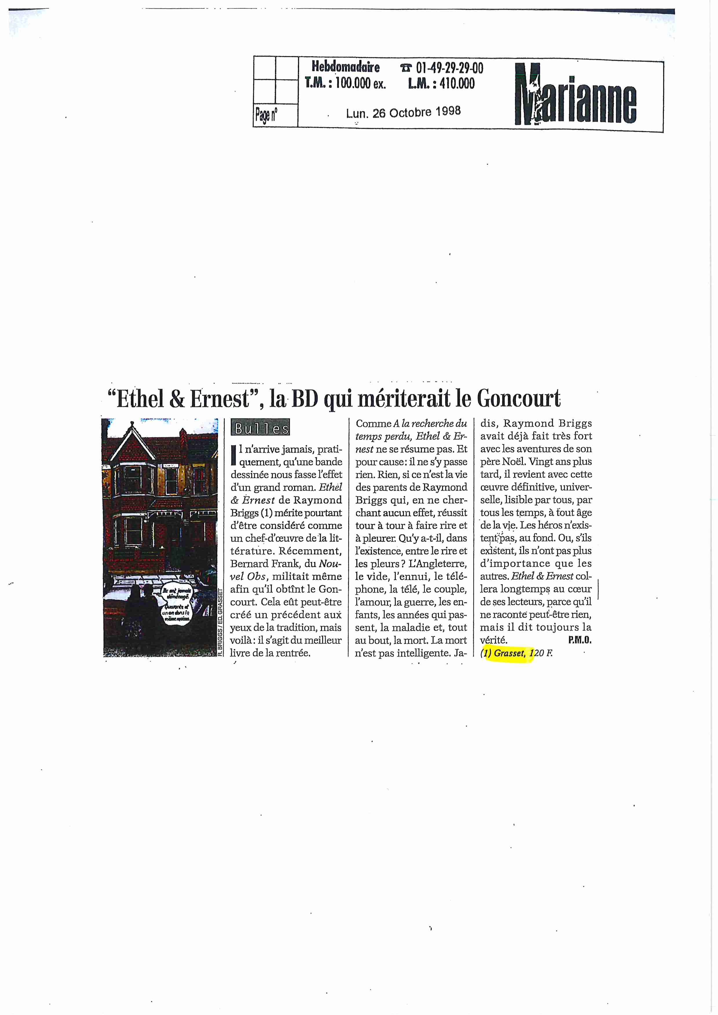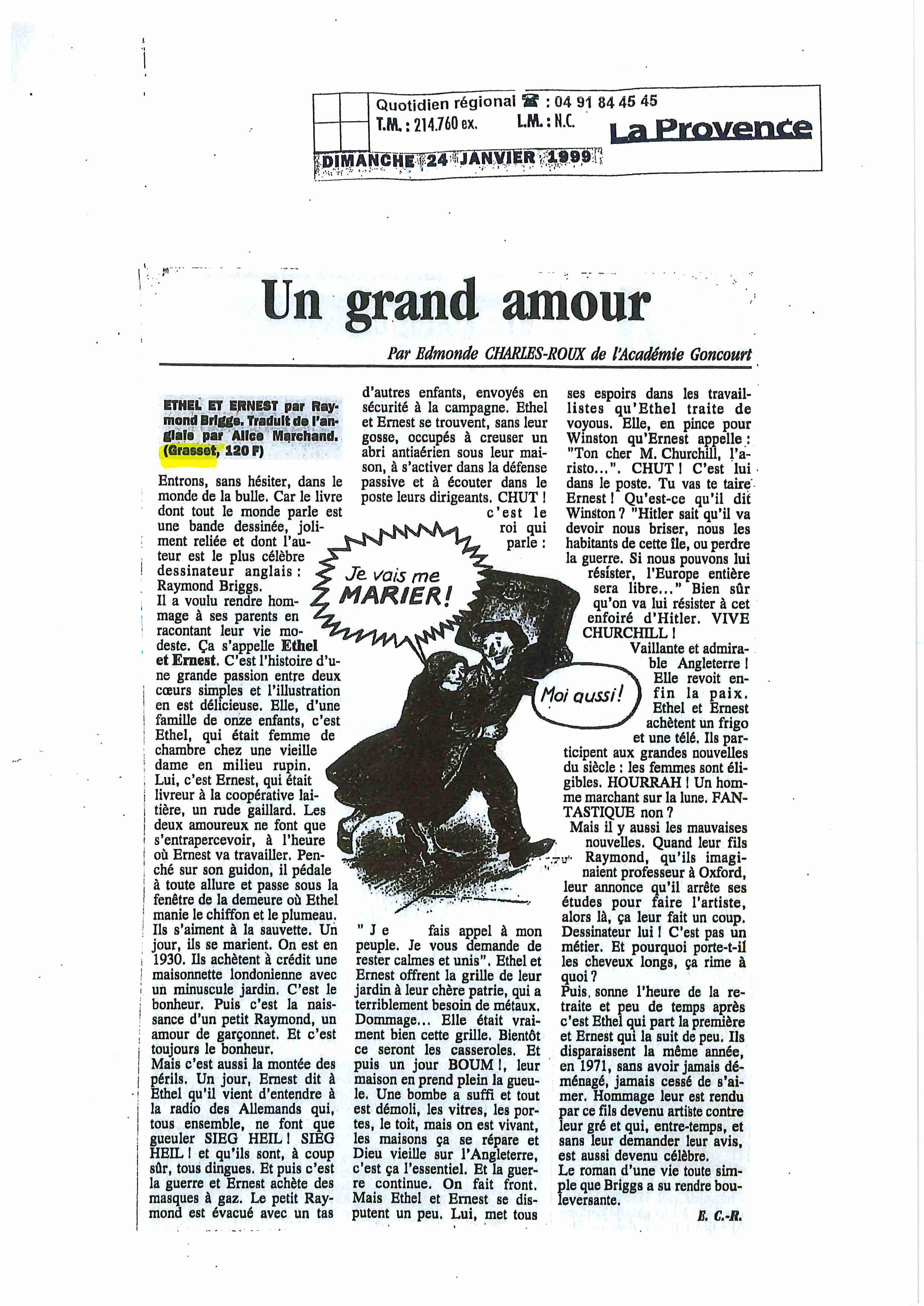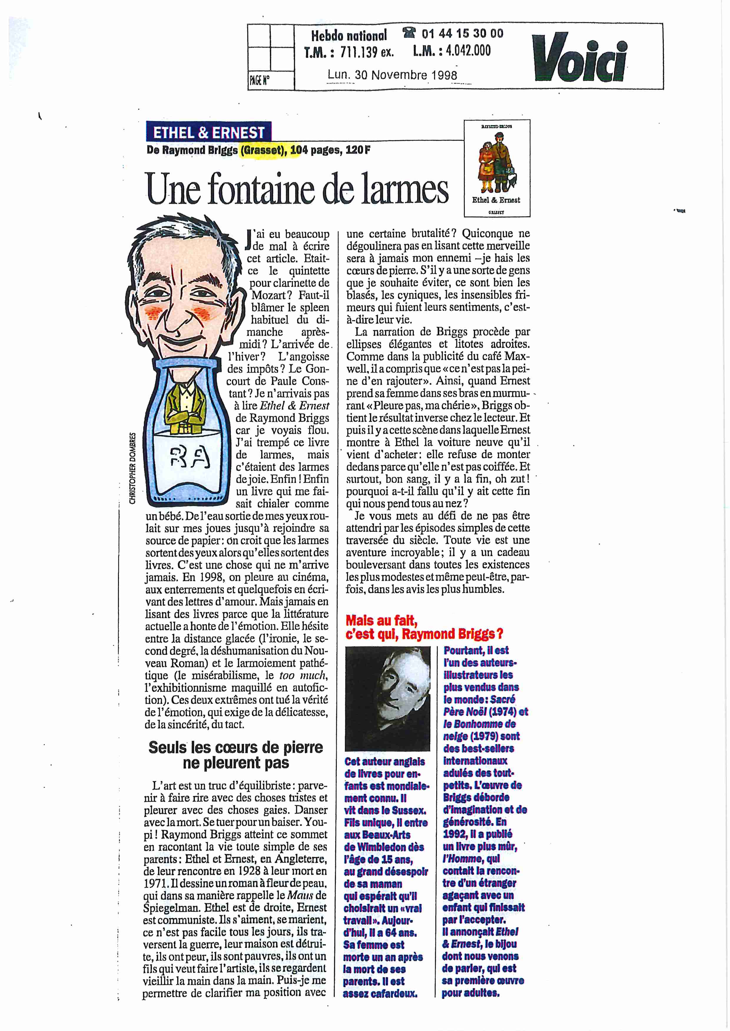 ON EN PARLE ! ● Le Journal du Dimanche : « Cette BD vous remue jusqu’au tréfonds du cœur. À lire absolument. » ● Marianne : « Un chef d’œuvre de la littérature. » ● Télérama : « Au bout du sourire et du rire, le frisson de l’émotion pure. » ● Depuis le cadre de ma fenêtre : « L’histoire n’est pas celle d’un couple fictif mais des parents de l’auteur, Raymond Briggs. Elle est touchante car le regard qu’ils portent sur la société en mutation est souvent décalé et innocent. C’est une page de l’histoire qu’ils nous offrent avec un regard différent : la naissance de la télévision, le téléphone en mutation, le premier pas sur la Lune, les hippies, … Le portrait que l’auteur a dressé, loin d’être lisse ne cache pas les défauts de ses personnages et ils deviennent comme des membres de notre famille que l’on prend plaisir à voir se chamailler, qui nous font sourire par des réparties plus drôles les unes que les autres et qui nous montrent une innocence souvent perdu qui les rend attachants. Il existe également un superbe animé réalisé par Roger Mainwood, sorti en 2016 pour ceux qui aimeraient poursuivre ou commencer par là. » ●