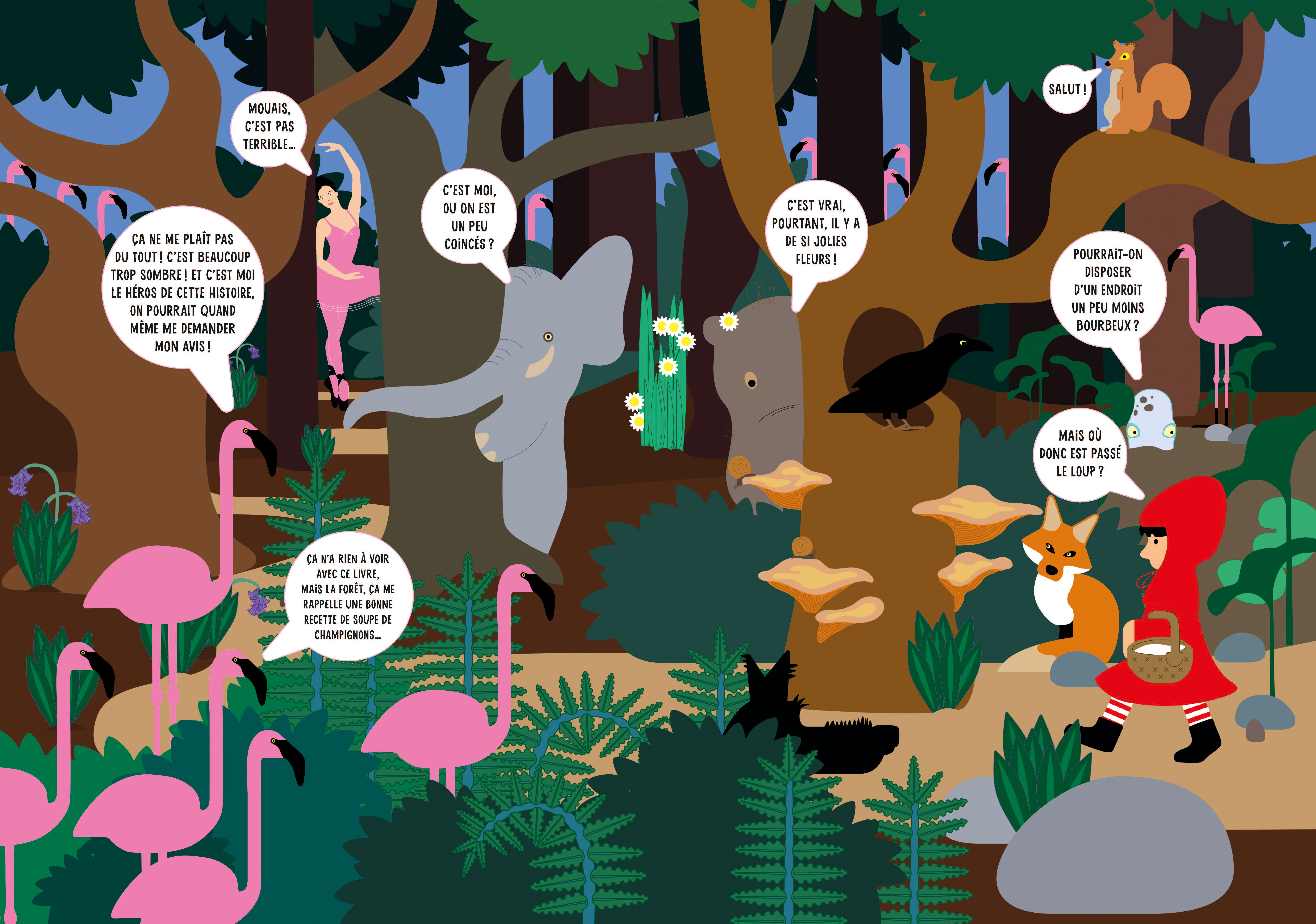 Dans ce grand album ludique et foisonnant, les personnages se révoltent contre les choix de l’auteure et de l’illustratrice : pas facile de contenter tout le monde ! Page après page, les surprises se succèdent, et l’on retrouve avec bonheur le style très graphique de Janik Coat, qui se prête à merveille au principe d’accumulation et de joyeux bazar qui se déploie dans ce livre, au fil de… la construction d’un livre, justement !