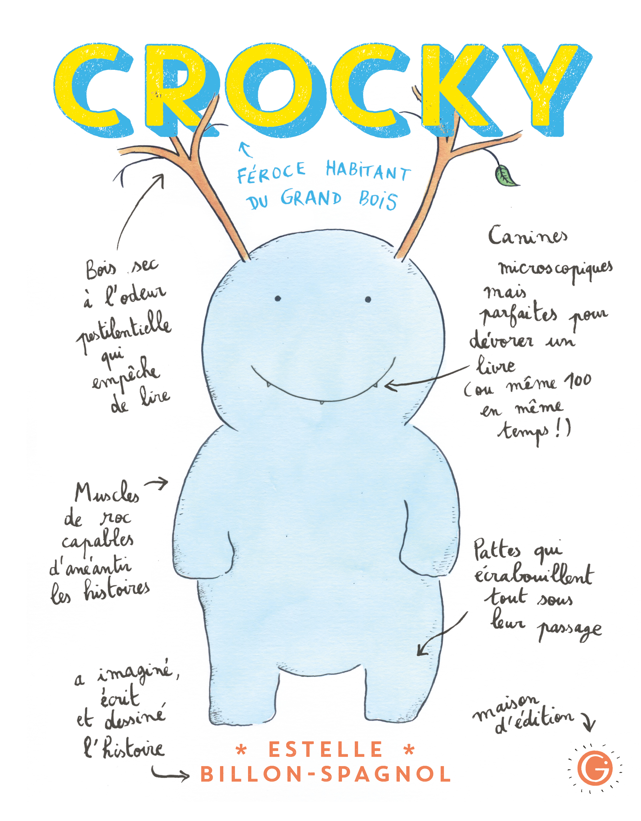 ON EN PARLE ! ● RCF : « À l’image de l’histoire, les couleurs, à l’aquarelle, sont très douces et les illustrations foisonnent de détails. Si Crocky est à découvrir dès 3 ans, il saura ravir également les grands lecteurs par l’originalité et la grande précision de ses illustrations. » ● Mya books : « C’est super mignon et tellement drôle ! J’ai adoré et mes enfants aussi. C’est vraiment une pépite que l’on va conserver précieusement dans notre bibliothèque et je pense qu’on s’y replongera très souvent ! » ● Lietje : « Plein de surprises et de rebonds, c’est une jolie histoire racontée par un texte utilisant différentes typographies et différents types de discours. Les images ont une grande simplicité et un dynamisme réjouissant, à la portée de tous les lecteurs. » ● À vos marques tapage : « Après le tendre et trop rigolo « Piouh » (chroniqué ici !) qui nous avait fait fondre de plaisir, Estelle Billon-Spagnol nous invite à nouveau, avec un humour désopilant et une belle originalité, dans son univers où l’on se laisse glisser avec délices ! A partir de 5 ans. » ● Blog des Arts : « Précédemment nous avions adoré « Piouh » que nous vous conseillons. C’est un adorable oiseau jaune, petit habitant des bois avec ses amis Coxy et Gernoule et Gisèle la fleur. Ce nouvel album est tout aussi craquant. La réputation de Crocky est terrible. Quand il pénètre dans le bois c’est la panique. Piouh qui d’habitude n’a peur de rien a dorénavant peur de tout. Peut-être vaudrait-il mieux connaître Crocky ? Humour et tendresse sont au rendez-vous. A partir de 3 ans. » ● Encres vagabondes : « Ouvrir cet album, c’est pénétrer au cœur d’un imaginaire débordant. Les dessins, très drôles, regorgent d’informations et de détails. Chaque petit coin est exploré, chaque petite peur est dénichée. Voici un livre pour partir à la rencontre de ses peurs et les surmonter, fouiller son imaginaire, ses craintes et ses envies. Un album, tendre et plein d’amitié, pour aller à la rencontre de l’autre plus sereinement, avec moins d’idées reçues et plus le désir de s’enrichir mutuellement. Un album plein de peps et de vie ! » ● Le Tourneur de pages : « L’autrice semble parfois reprendre le découpage d’une bande dessinée sans utiliser les contours des cases. Il n’y a aucune frontière, aucun carcan autour des personnages et de leur mouvement. Cet album devient un terrain de jeux où chaque page est revue et corrigée (c’est peut-être le premier livre qui donne envie de lire les mentions légales). Des parenthèses s’ouvrent ainsi pour explorer des sujets, comme les légendes du Crocky, la géographie du monde entier ou encore des avertissements sur la champimaison. La joie de rencontre et de dialogue nourrie par une liberté créatrice est absolument communicative. » ● Les Demoiselles de Châtillon : « Les peurs, les préjugés, l’amitié, le tout abordé avec humour et servi par des illustrations vraiment trop craquantes. Les dessins foisonnent de détails à regarder. On revient sur chaque page, on observe tout et on se demande qui est le plus craquant parmi tous ces personnages adorables. Le texte est court, drôle et tendre et les petits lecteurs s’identifieront facilement à ce petit poussin tout jaune et tout rond. On prend un réel plaisir à lire, vraiment TOUT lire, même les mentions légales. On a adoré l’effrayant Crocky, Piouh le poussin, la coccinelle et la grenouille péteuse (la recette du plat préféré du Crocky va beaucoup plaire aux enfants !) » ● Paris Librairies : « Un livre qui se croque et recroque ! Gros gros coup de coeur pour ce livre sur la peur de l’autre (qu’il faut surmonter !), la différence, l’amitié… Piouh et ses amis n’ont peur de rien, sauf… de Crocky, qu’ils ne connaissent pas mais redoutent plus que tout. Jusqu’au jour où ils le rencontrent. Et là… Il ne fait pas si peur finalement Crocky ! Variations de mise en page, couleurs tendres, dialogues rigolos… Un livre que l’on croque de toutes ses dents et de tous ses yeux ! A lire dès 4 ans (et bien après…) Marie-Eve, Librairie Paroles, Saint-Mandé. » ● Facebook, Christian Poslaniec : « TOUS LES POUSSINS COPINENT AVEC LES MONSTRES. Piouh, le poussin jaune coiffé d’un « bonnet parfait », le « petit habitant des grands bois », on le connaît, vu qu’il est né il y a trois ans chez le même éditeur. L’adorable Piouh, aussi mignon que Petit Poupou, un charmant poussin coiffé d’un bonnet jaune (d’Isabelle Bonameau, l’école des loisirs, 2020) dont les amis sont des monstres gla-gla-gla. Il y a Grouf, Lili-Rose, Crollette et Trompette, prêts à le suivre dans une expédition mystérieuse. Rien de tel pour Piouh. Le monstre, «féroce visiteur du grand bois», comme dit le sous-titre de l’album, s’appelle Crocky, et ce n’est pas l’ami du poussin jaune (celui du Seuil, pas Petit Poupou!) Pourtant la bonhomie du bonhomme bleu souriant représenté en couverture n’incite pas le lecteur à soupçonner que Crocky croque quiconque ! Mais justement, le lecteur s’emberlificote dans ce récit délirant, foisonnant, inventif, sans queue ni tête mais bien rangé sur les étagères de la création. D’abord, l’album ne joue nullement le jeu du gentil et du méchant en opposant les deux personnages. Au contraire, d’entrée de jeu, une comparaison s’esquisse. Au point que lorsque Piouh et Crocky deviennent amis, ils font les comptes et constatent avoir « 104 différences et 104 points communs ». Ensuite, par le glissement des mots et des sens, la poésie envahit tout l’espace de ce qui aurait pu être un affrontement et les images jouent le même jeu. Par exemple le délire de toutes les peurs de Piouh, dont « l’ombre de la fleur Gisèle » mais aussi les « morsures de tigre » ; Crocky qui devient « féroce croqueur de vie »