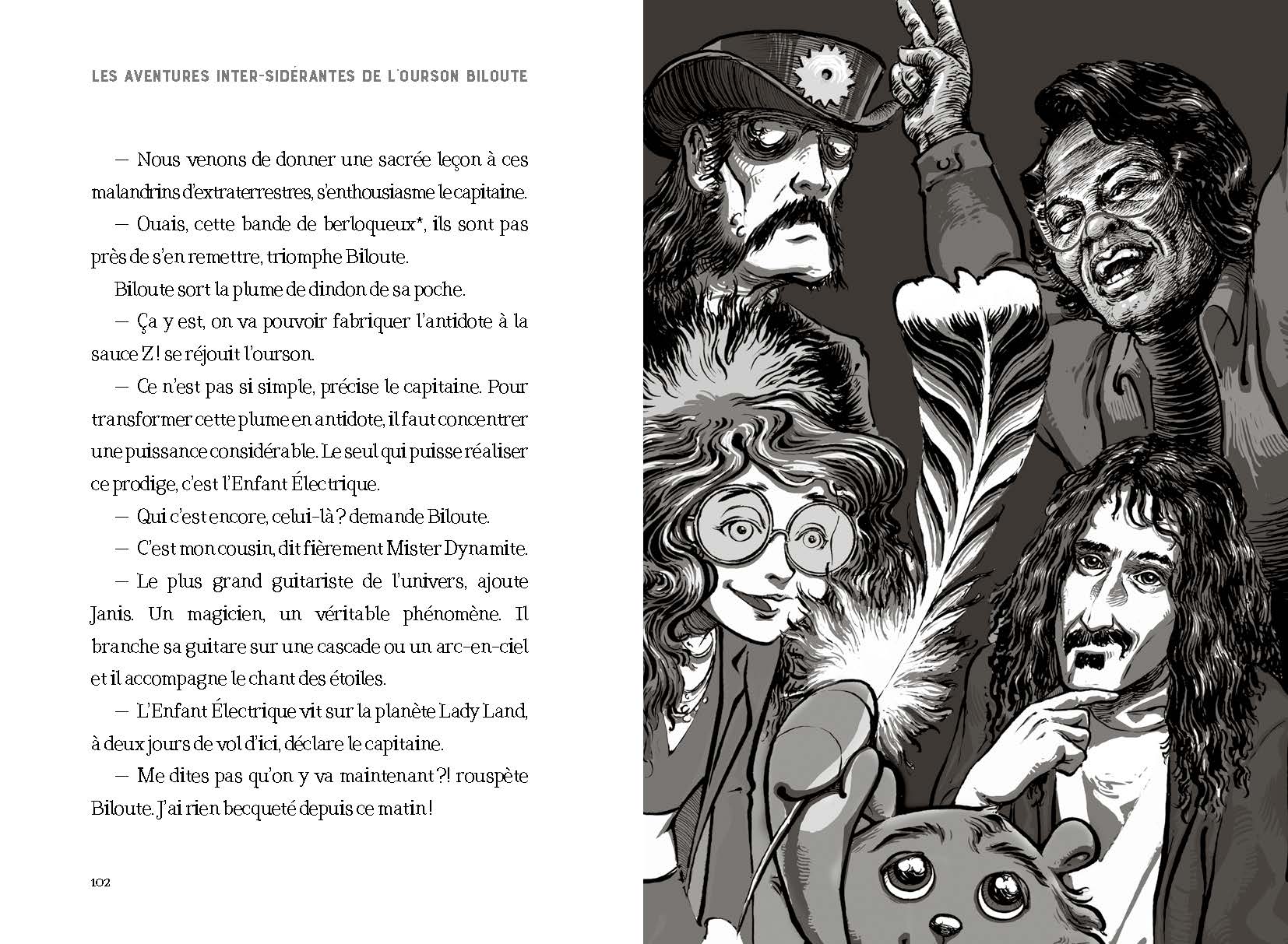 Dans Les Aventures inter-sidérantes de l’Ourson Biloute, bourrées de références en tous genres, on rencontrera Janis (Janis Joplin), Lemmy (de Motörhead), Georges Clinton, Frank Zappa, James Brown, Vieux-Os (Dany Laferrière), Ziggy l’homme-libellule (David Bowie), La Reine (Freddie Mercury), l’Enfant Électrique (Jimmy Hendrix), Nina (Nina Hagen), Patti (Patti Smith) Debbie (Debbie Harry du groupe Blondie) et Virginie (Virginie Despentes), membres de la Girl Alliance, Le Mage (Bob Marley), The Ramones… Tous vont devoir unir leurs forces pour parvenir à contrer la menace de la Galaxie Fantôme et sauver la terre et l’humanité !