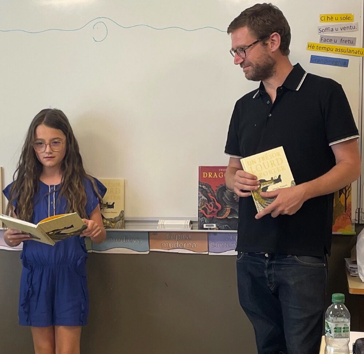 Pour se préparer, Lialena a accueilli Maxime Derouen à venir dans sa classe, en Corse. L’auteur a pu dévoiler les coulisses de son travail d’écriture, présenter les personnages, répondre aux questions des enfants et donner ses derniers conseils à Lianela pour bien lire à voix haute. De beaux moments d’échange !