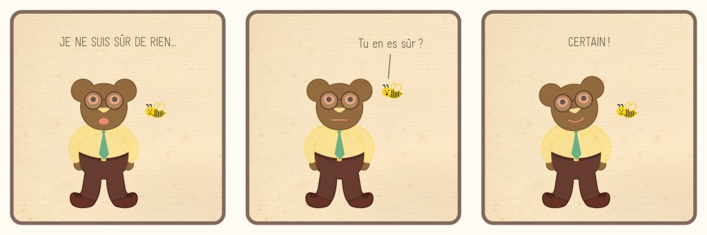Dans de courts échanges, sous forme de strips de 3 cases comme autant de petites bandes-dessinées, Monsieur Nourse et l’abeille dialoguent, et se posent toutes sortes de questions sur l’amitié, l’existence, la vie, le monde… Ils jouent avec la logique, les évidences, les certitudes et les incertitudes, et amènent le jeune lecteur à se familiariser avec les interrogations, la discussion et les mécanismes parfois subtils de la pensée.
