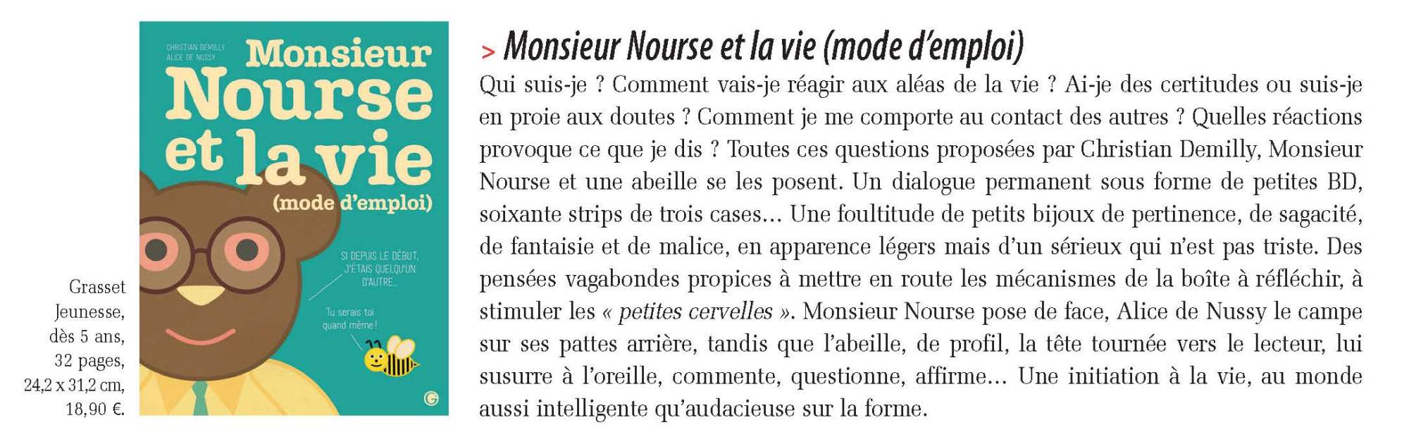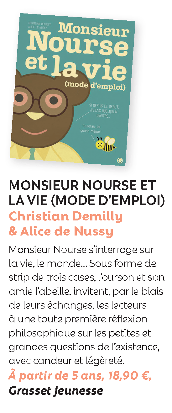 ON EN PARLE ! ● Kibookin : « Malin ! Ils jouent avec la logique, les évidences, les certitudes et les incertitudes, et amènent le jeune lecteur à se familiariser avec les interrogations, la discussion et les mécanismes parfois subtils de la pensée. » ● À vos marques tapage : « Une originale introduction à la philosophie propice à de multiples discussions à partager en famille ! À partir de 5 ans. » ● Lietje : « On retrouve une question évoquant un choix difficile comme : « comment rattraper le temps passé à rechercher le temps perdu ? » Ces ours sont de bien grands questionneurs ! » ● Blog des arts : « Ils jouent avec la logique, les évidences, les certitudes et les incertitudes, et amènent le jeune lecteur à se familiariser avec les interrogations, la discussion et les mécanismes parfois subtils de la pensée. » ● Librairie Les Sandales : « Un album à offrir et à savourer sans modération avec les enfants qui sauront apporter d’autres réponses qui risquent fort de vous le réclamer encore et encore. Formidable ! » ● Le café pédagogique : « Un album dans lequel piocher des réflexions sur la vie, ou à dévorer pour sourire de nos contradictions. » ● Babelio, @Idiosyncrazy : « Les réflexions des deux protagonistes font réfléchir et peuvent amener les enfants à des discussions avec les parents. » ● Klesia : « Monsieur Nourse s’interroge sur la vie, le monde… Sous forme de strip de trois cases, l’ourson et son amie l’abeille, invitent, par le biais de leurs échanges, les lecteurs à une toute première réflexion philosophique sur les petites et grandes questions de l’existence, avec candeur et légèreté. » ● Liberté Hebdo : « Une initiation à la vie, au monde aussi intelligente qu’audacieuse sur la forme. » ● Bruxelles Culture : « Voilà une sorte de livre philosophique adapté aux enfants. Pas de la grande philosophie comme on l’étudie dans les écoles, mais des réflexions qui brasent de sujets de tous les jours et qui les analysent avec justesse par le petit trou de la lorgnette. La gourmandise, les trucs inutiles, l’absence, le secret, le journal intime, le bonheur, la vie douce et bien d’autres thématiques sont passées en revue pour offrir des petites leçons de sagesse qui prouvent – ô combien !- qu’il ne faut pas se mettre martel en tête pour vivre heureux ni galvauder les trésors intimes qu’on possède. » ● Croqu’Revue : « C’est délicat et très mignon, on adore ! » ● Kultur : « Cette publication permet, tout en légèreté, de s’amuser à penser, à réfléchir, à philosopher, à comprendre et analyser l’importance du discours et des mots. » ●