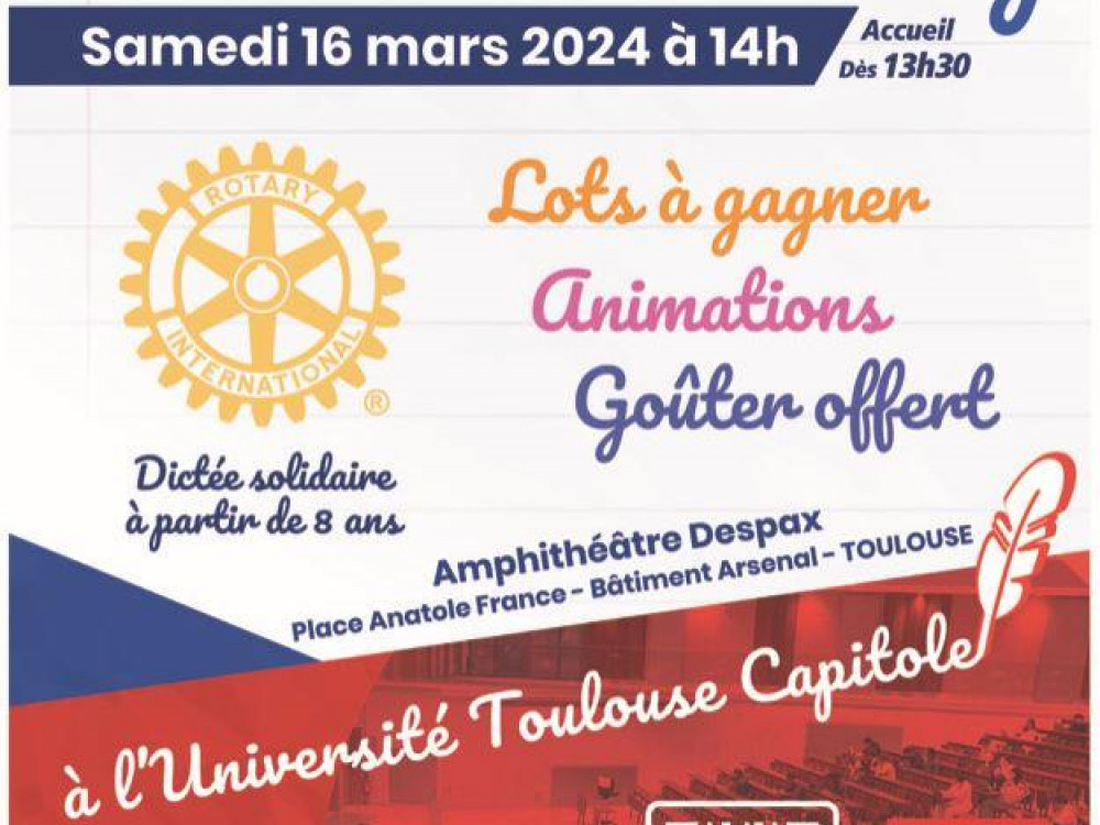 La dictée aura lieu le samedi 16 mars 2024 à 14h dans l’amphithéâtre Despax de l’Université Toulouse Capitole et sera accompagnée d’animations et d’un goûter.