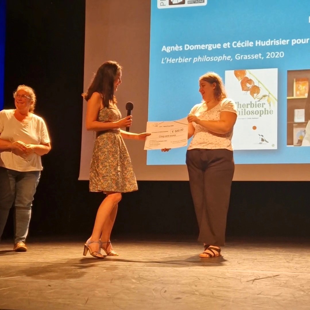 « Très heureuse pour notre album L’herbier Philosophe qui remporte le PRIX FACILE A LIRE de cette année ! La remise du prix pour Cécile et moi se déroulait à Guingamp, dans le théatre du Champ au Roy, puis dans la célèbre prison.