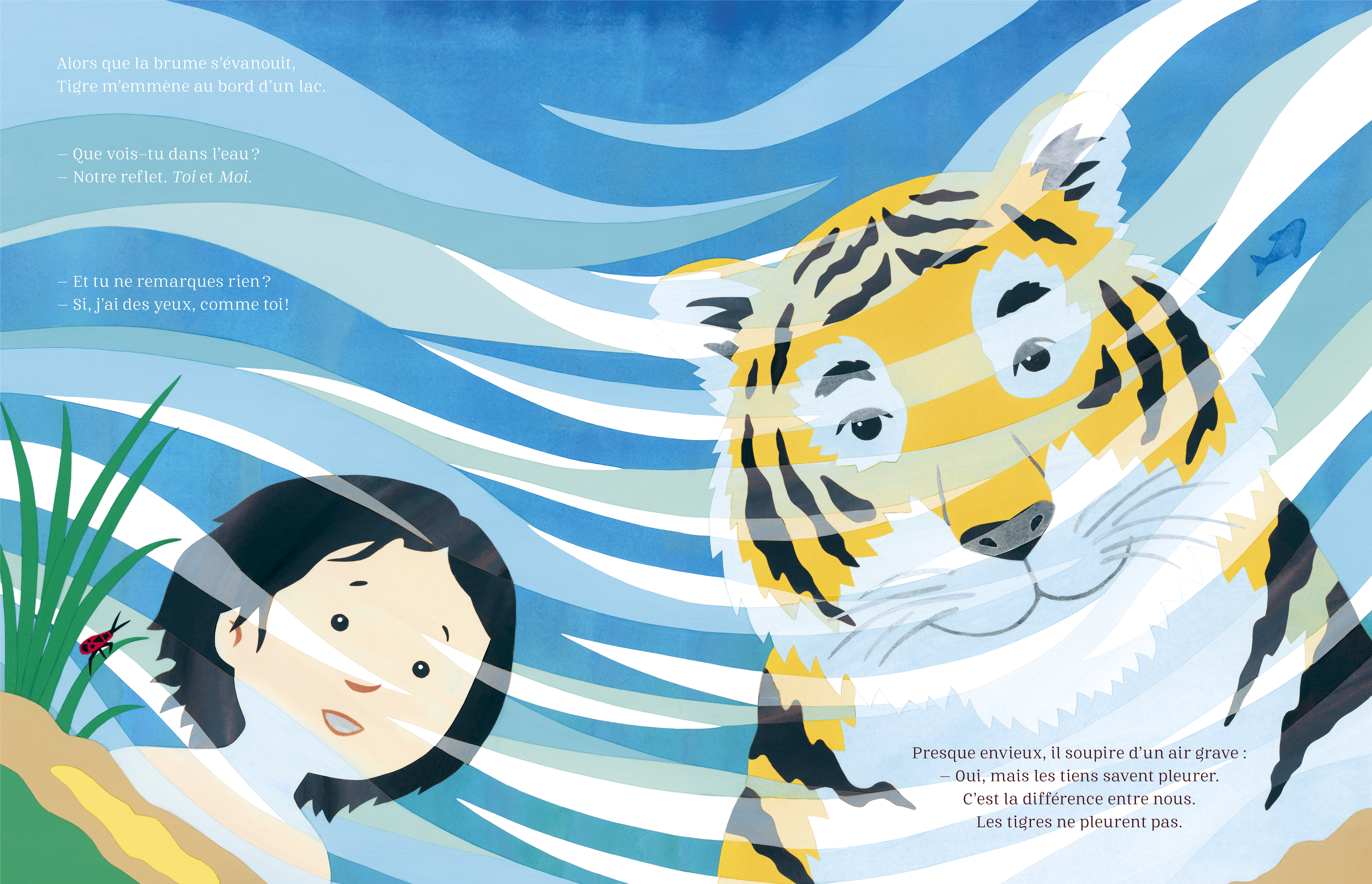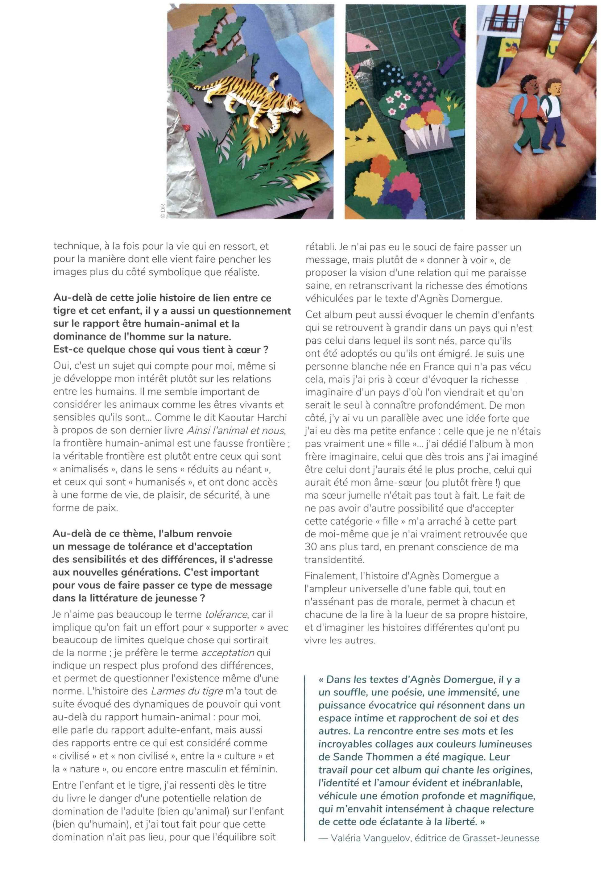 ON EN PARLE ! ● La mare aux mots : « Je viens de terminer mon premier album entièrement fait en papier découpé, une commande des éditions Grasset Jeunesse avec un texte d’Agnès Domergue. » ● @librairieclareton : « Doux, délicat et touchant, un ouvrage à mettre au pied du sapin 🎄. » ● @lecartabledemrchristophe : « Un album fort et beau qui véhicule une émotion intense entre une petite fille et un tigre. Un magnifique livre-cadeau au message puissant à découvrir et à partager. 🤓💖 À travers leur histoire, on peut lire celle de la naissance, de la vie, de la quête de soi malgré les diktats sociaux, de l’identité et de l’amour si précieux que rien ne peut briser… » ● Bruxelles Culture : « Un album qui véhicule une émotion réelle qui parle de la naissance de la vie, des dictats sociétaux, de l’identité de la quête de soi et du bonheur indéfectible de la présence de ceux qu’on aime. » ● @librairielepreau : « Des images éblouissantes tout en collages minutieux et en délicatesse ! » ● À vos marques tapage : « Une histoire magique, habillée de mots poétiques et d’illustrations de toute beauté, qui suscitera de profondes réflexions et de belles émotions à vos p’tits loups. Magnifique !!! A partir de 4 ans. » ● @delartetdeshistoires : « Un album qui m’a beaucoup touchée, à plusieurs niveaux de lecture. Qui ose encore dire que la littérature jeunesse est exclusivement réservée aux enfants ? » ● Biblioteca Jeunesse : « Ce très bel album aux magnifiques collages est une déclaration d’amour à la nature, illustrée par cette amitié. Nature, Amitié, Animaux » – couverture de la revue ● Fenêtre sur cours – Lire/sortir : « Une magnifique fable sur l’amitié, aux paysages doux et colorés. » ● France Net Infos : « Une tendre histoire d’amitié, entre une fillette et un tigre, qui malgré une douloureuse séparation, ne vont cesser de se chercher, entre quête de soi, amour infini et reconnaissance. » ● Citrouille (2 pages) : « L’histoire d’Agnès Domergue a l’ampleur universelle d’une fable qui, tout en n’assénant pas de morale, permet à chacun et chacune de la lire à la lueur de sa propre histoire, et d’imaginer les histoires différentes qu’ont pu vivre les autres. » ● Lu et partagé : « On sent chez ce duo de créateurs que l’inspiration asiatique est au cœur de leurs albums, les illustrations colorées composées de collages subliment ce bel acte d’amitié et de liberté entre l’enfant et la vie sauvage sur un texte poétique. A partir de 5 ans. (L.B.) » ● Bruxelles Culture : « Un album qui véhicule une émotion réelle qui parle de la naissance de la vie, des dictats sociétaux, de l’identité de la quête de soi et du bonheur indéfectible de la présence de ceux qu’on aime. » ● Encres vagabondes : « Voici un très bel album pour conter un amour si grand qu’il est capable de tout surmonter. Un livre, magnifiquement ! » ● La Dépêche Verneuil : « Une belle histoire d’amitié, de séparation et de retrouvailles. » ● NVL la revue : « Un beau moment de lecture pour les yeux. OM » ● @le_chat_qui_dort : « Nous aurons la joie de l’accueillir sur notre stand à cette occasion. » ● @hachettefr : « Découvrez à travers leur histoire celle de la naissance, de la vie, de la quête de soi malgré les diktats sociaux et d’un amour si précieux que rien ne peut briser. » ● Livrjeun : « Une belle ode à l’amitié au travers de l’histoire de ce tigre et de cette petite fille qui, malgré leurs différences, ont réussi à créer entre eux un lien profond et sincère capable de dépasser la distance et le temps. Leur relation est vraiment touchante. De très belles illustrations au trait simple et aux couleurs chatoyantes. Les toutes premières ne sont pas sans me rappeler personnellement le Livre de la jungle de mon enfance et le personnage de Mowgli. – Sylvie DULAC » ● Les notes : « Dans cet album grand format, proche d’une fable, il est question de l’enfance, de l’amitié entre une petite fille et un animal, de séparation et de quête. Le texte est simple, rythmé, pétri de tendresse. » ● @mamzellepotter : « Malgré leurs différences, malgré leur langage différent, ils arrivent à créer un lien profond et sincère. c’est une histoire qui se lit très bien, parfaite pour celles et ceux qui débutant la lecture, je trouve grâce à une police de caractère qui s’y prête. » ● Conso-mag : « J’ai réellement adoré l’expérience globale de lecture, tout comme mon fils. Les dessins sont magnifiques, les moments passés entre le tigre et la jeune fille sont doux et sonnent comme un véritable chant à la gloire de l’amitié et de la connexion à la nature. » ● Lietje : « Simplicité du dessin, couleurs chatoyantes en beaux dégradés, animaux cachés un peu partout, une dominante de verts et de bleus, tout donne aux images de cet album, où les doubles pages se déploient en grand format, une allure de paradis exotique du douanier Rousseau. » ●