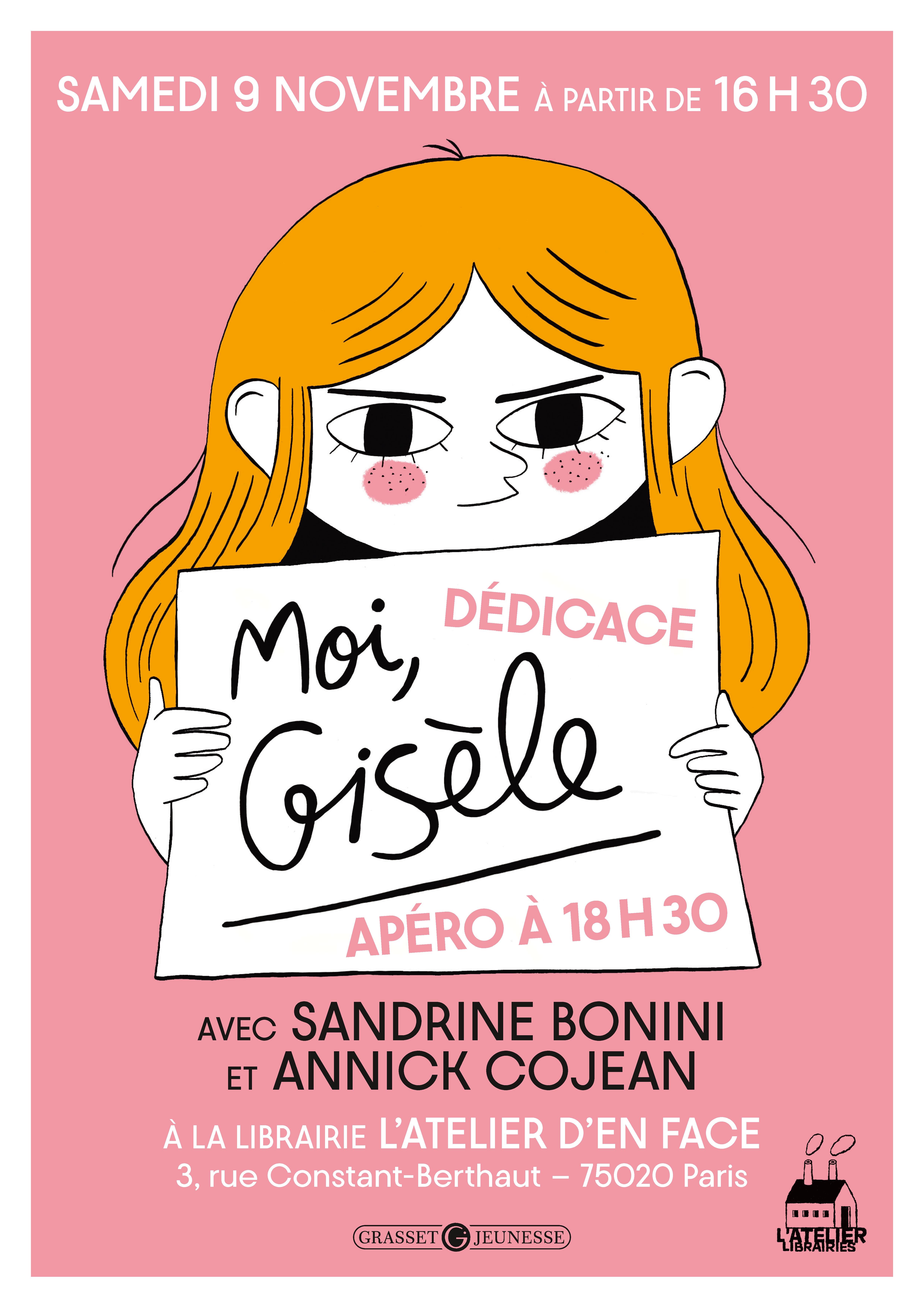Ce samedi 9 novembre à 16h30, la librairie L’Atelier (2 bis rue Jourdain, 75020 Paris) aura l’honneur d’accueillir Sandrine Bonini et Annick Cojean pour une séance de dédicaces exceptionnelle de leur tout nouvel album, Moi, Gisèle publié chez Grasset-Jeunesse.
