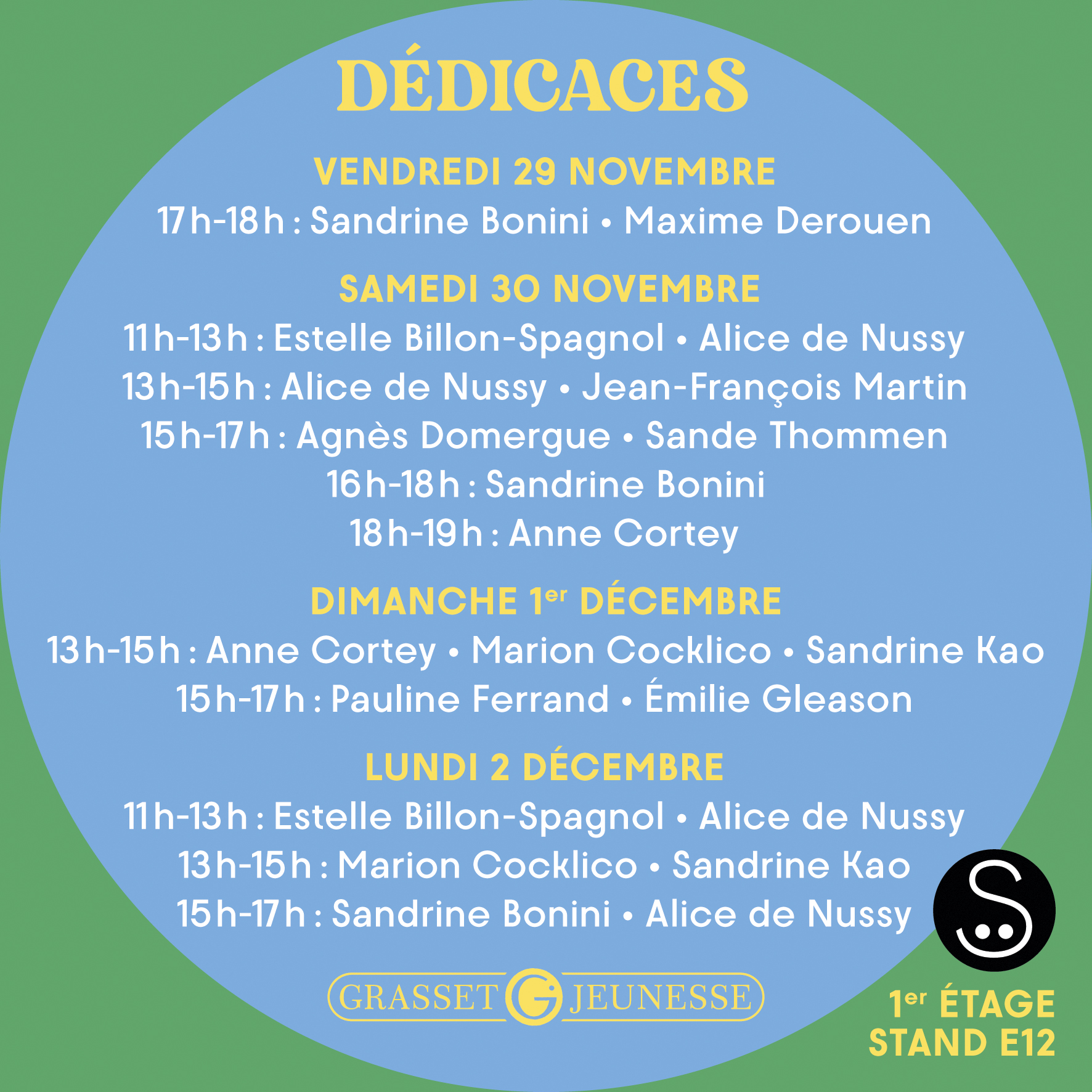 Le Salon du Livre et de la Presse Jeunesse de Montreuil (du mercredi 27 novembre au lundi 2 décembre) s’annonce riche en rencontres cette année, avec un programme de dédicaces haut en couleur organisé sur le stand Grasset Jeunesse (1er étage, stand E12).