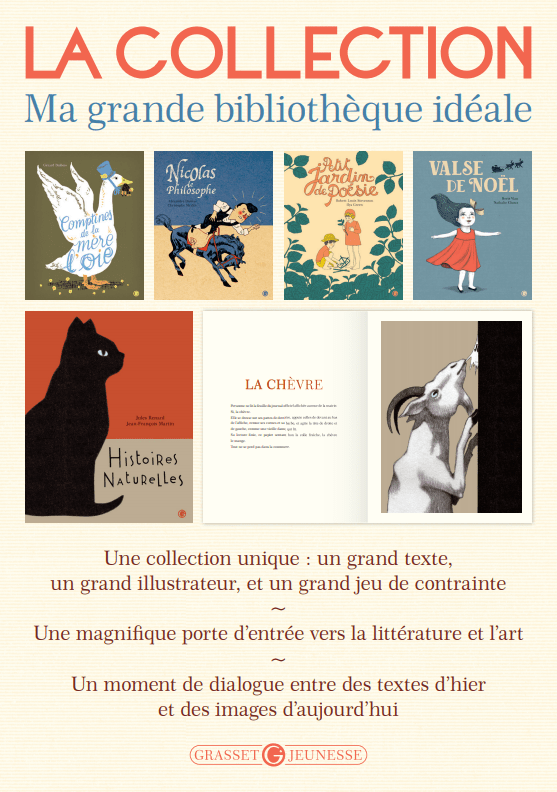 La Collection, en effet, s’inscrit dans une continuité naturelle de la ligne éditoriale que Grasset-Jeunesse poursuit ses débuts : grands auteurs, grands illustrateurs, audace graphique, beaux objets et livres offrir, s’offrir et à partager entre générations…Quand Brigitte Stéphan en a eu l’idée, c’est avec évidence que nous l’avons accueillie, enthousiasmés également par ses aspects ludiques, surprenants et esthétiques.