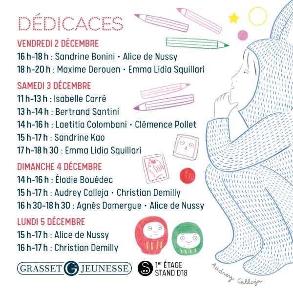 nos dédicaces avec Sandrine Bonini, Alice de Nussy, Maxime Derouen, Emma Lidia Squillari, Isabelle Carré, Bertrand Santini, Laetitia Colombani, Clémence Pollet, Sandrine Kao, Elodie Bouédec, Audrey Calleja, Christian Demilly et Agnès Domergue